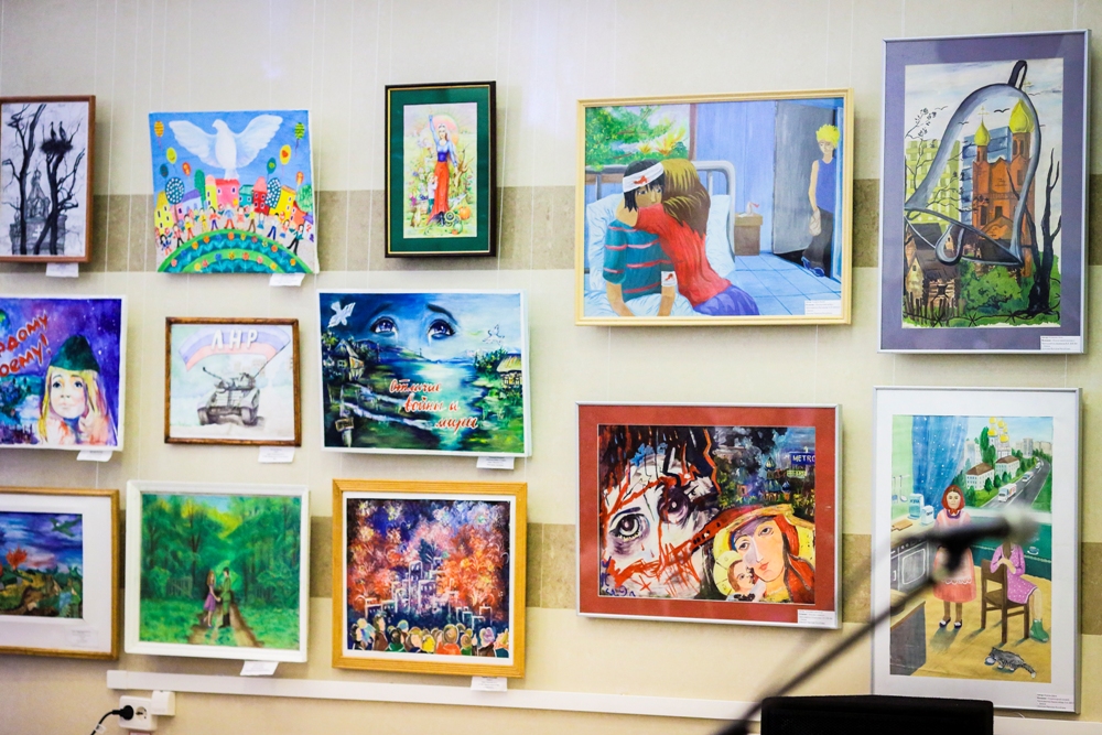 В экспозиции, привезенной в Симферополь делегациями Донецкой и Луганской Народных Республик, представлено более 100 работ луганских и донецких школьников, посвященных военным событиям в регионе.