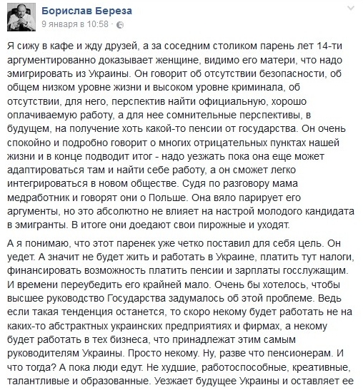 «Я сижу в кафе и жду друзей, а за соседним столиком парень лет 14-ти аргументированно доказывает женщине, видимо его матери, что надо эмигрировать из Украины.