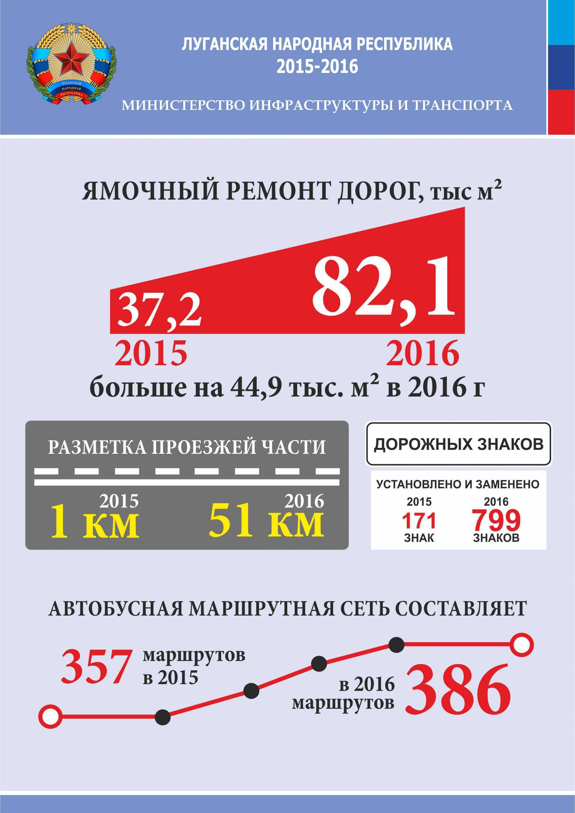 Основной задачей Министерства инфраструктуры и транспорта ЛНР является развитие и содержание сети автомобильных дорог Республики, повышения транспортно-эксплуатационного состояния автодорог общего пользования.