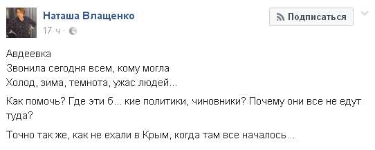 «Авдеевка. Звонила сегодня всем, кому могла. Холод, зима, темнота, ужас людей… Как помочь? Где эти б… кие политики, чиновники? Почему они все не едут туда? Точно так же, как не ехали в Крым, когда там все началось…» — написала она на своей странице в соцсети.