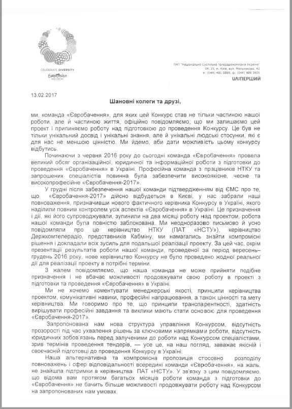 «Мы, команда «Евровидение», для которых этот Конкурс стал не только частью нашей работы, но и частью жизни, официально сообщаем, что мы оставляем этот проект и прекращаем работу над подготовкой к проведению Конкурса. Это был не только уникальный опыт и уникальные знания, но и уникальные человеческие отношения, которые являются для нас не меньшей ценностью. Мы идем, чтобы дать возможность этому конкурсу состояться.