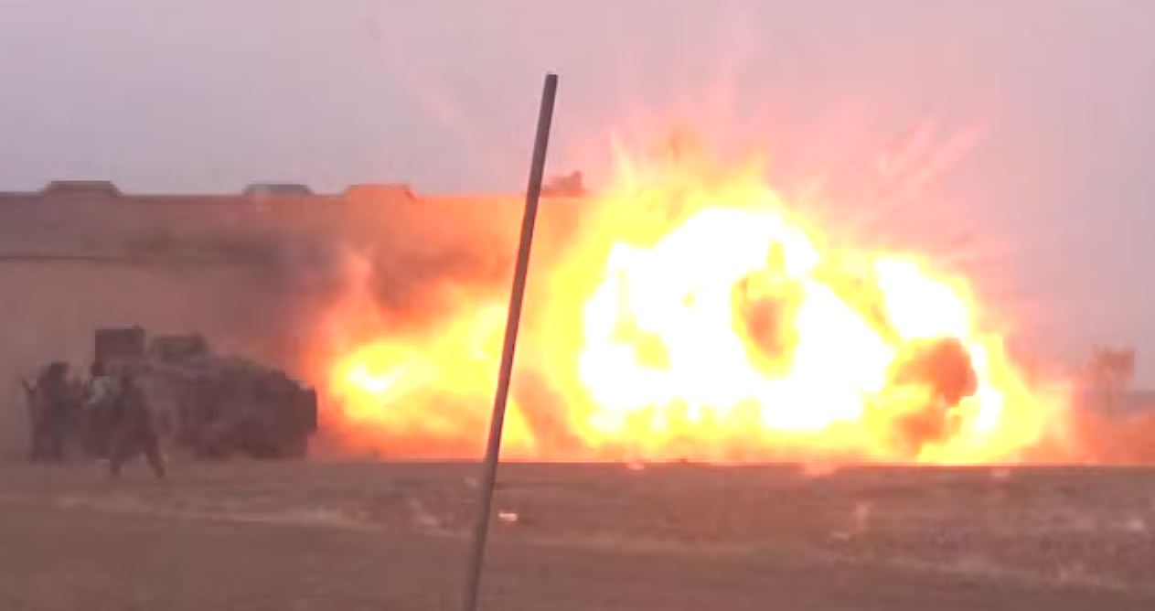 На кадрах хорошо видно, как «игиловец» в поясе смертника выпрыгивает из-за угла здания в сторону женщин-ополченок ДСС, но взрывается раньше времени. Так как курды успели спрятаться за бронемашиной Hummer, то разорванный на части смертник принес им лишь небольшие проблемы в виде нескольких порезов осколками.