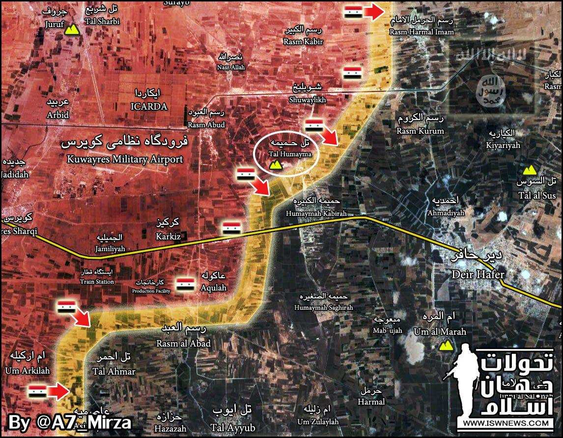 При поддержке мощных ударов ВКС России дивизии «Тигры» удалось освободить большую вершину холма Таль Хамайма, который расположен вдоль главной дороги, ведущей от Дейр Хафер к Аль-Бабу.