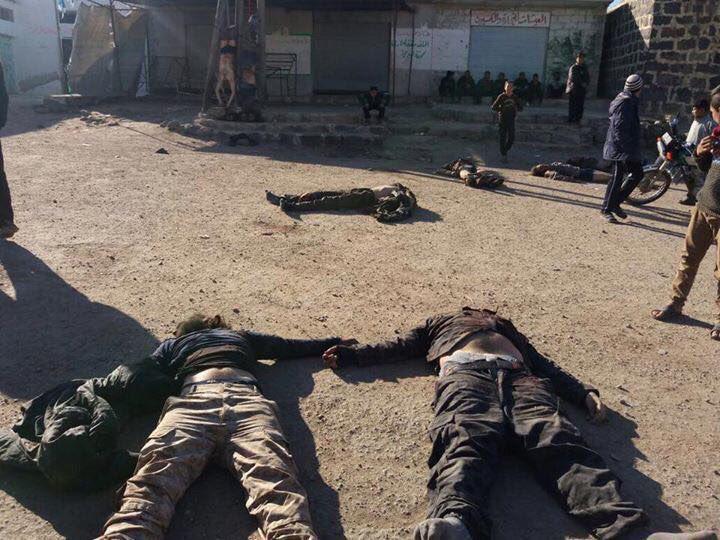 В понедельник «игиловцы» опубликовали кадры, показывающие около 20 убитых бандитов сирийской «оппозиции» в южной части провинции Дараа, они были убиты 20-го февраля в ходе ожесточенных столкновений.
