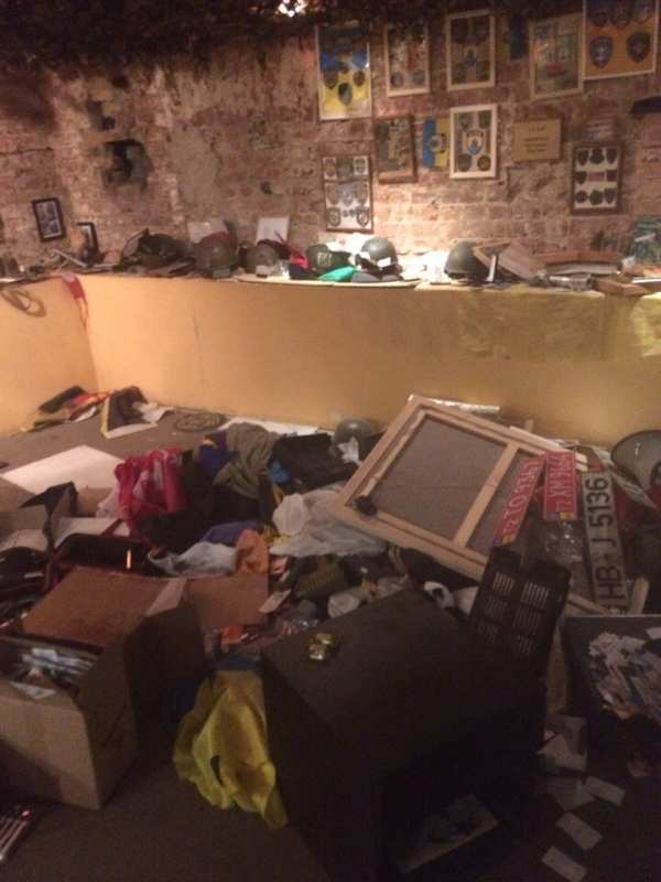 Стена Славы также разгромлена, а боевой флаг ДШРГ «Русич» забит в угол… Православные иконы из Луганска брошены в трофейные вещи укрокарателей, сломанный манекен «Беркутовец» валялся на полу при входе…