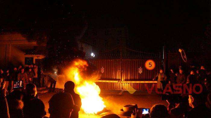 «Ветераны АТО» присоединились к всеукраинской акции поддержки блокады Донбасса и жгут костры и покрышки прямо перед зданием СБУ.