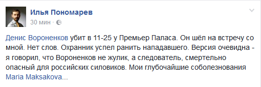 «Денис Вороненков убит в 11:25 (12:25 мск) у «Премьер паласа». Он шёл на встречу со мной. Нет слов. Охранник успел ранить нападавшего», — написал Пономарёв на своей странице в соцсети.