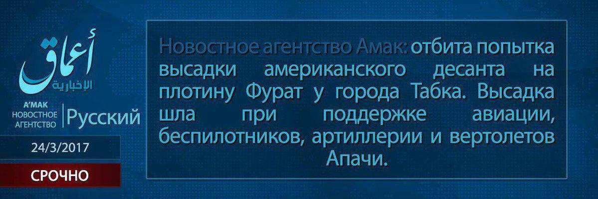 «Важно: Новая неудачная высадка десанта сил США вблизи Дамбы Евфрат. Там были группы ИГИЛ* с тяжелым вооружением».