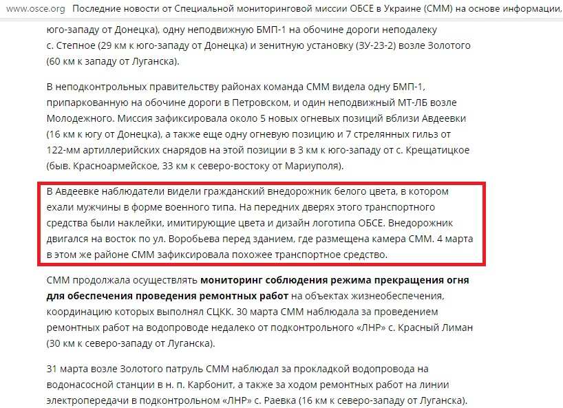 В очередном отчете Специальной Мониторинговой Миссии (СММ) ОБСЕ на Донбассе, отражающем ситуацию у линии соприкосновения на 31 марта 2017 года, говорится о вопиющем случае: в оккупированной Киевом Авдеевке наблюдатели заметили автомобиль с символикой, копирующей логотип СММ ОБСЕ.