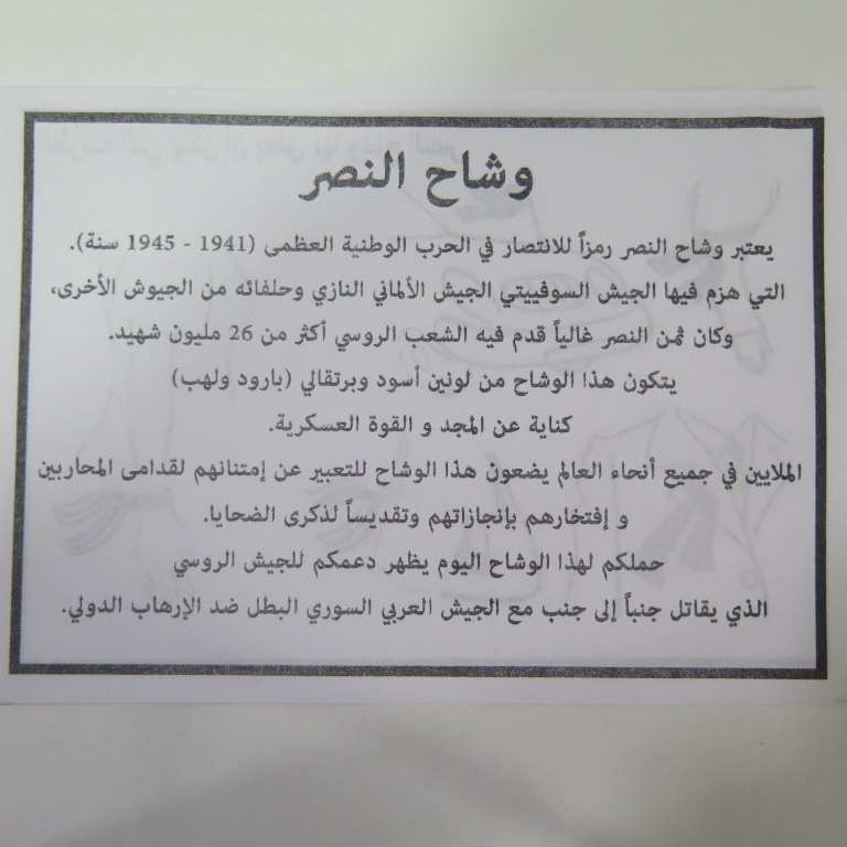 В листовке особо отмечается, что ленточка, являясь символом Победы в Великой Отечественной войне, сегодня в Сирии также «демонстрирует вашу (сирийского народа) поддержку российской армии, которая плечом к плечу с героической сирийской армией борется с международным терроризмом».