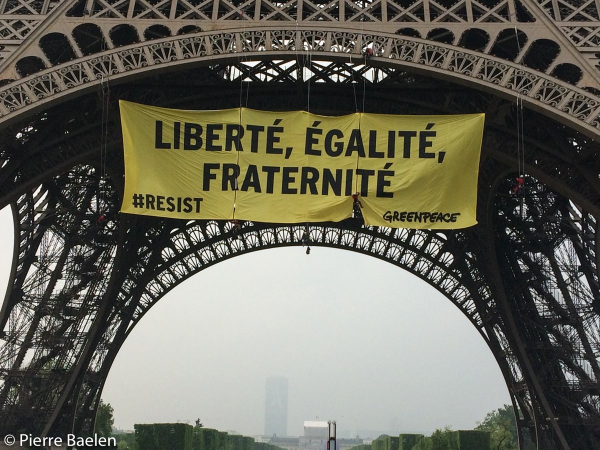 Активисты Greenpeace вывесили на Эйфелевой башне баннер и плакаты против кандидата в президенты Франции Марин Ле Пен.
