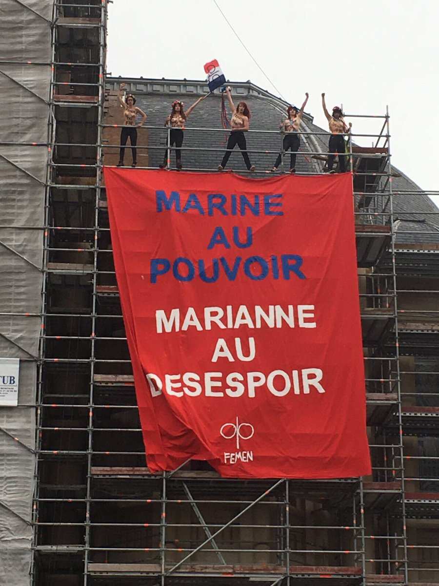 Как сообщается в Twitter движения Femen, девушки растянули огромный баннер с призывом голосовать против Марин Ле Пен, по традиции скинув с себя одежду.