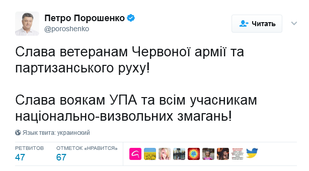 Лидер Украинского Государства на своей официальной страничке в твиттере неожиданно упомянул Красную Армию: