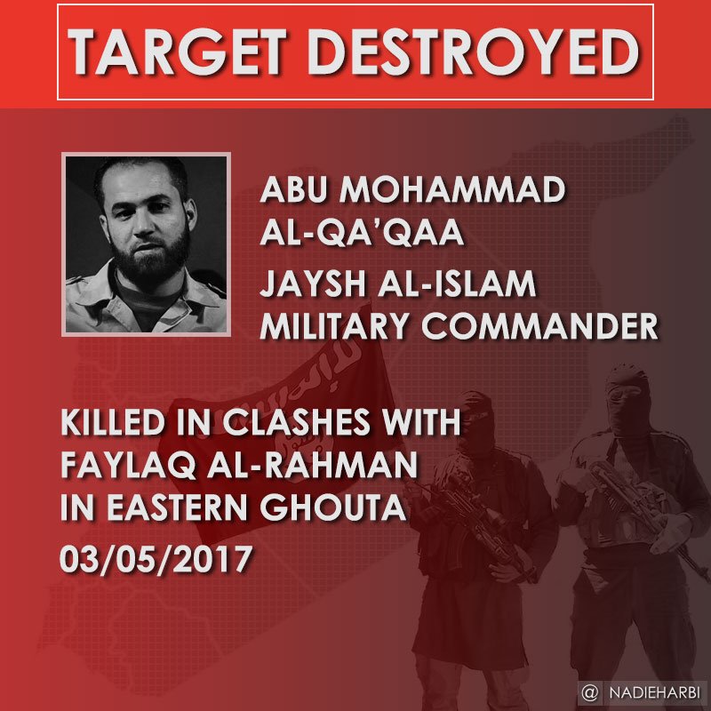 На фото убитые главари «Файлак ар-Рахман» и «Джейш аль-Ислам», а также склад оружия «Джебхат ан-Нусры», захваченный «Армией ислама»