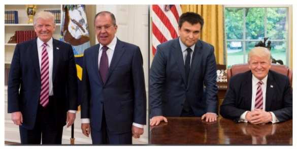 На одной фотографии Трамп стоит рядом с Лавровым, а на другой — сидит за столом в Овальном кабинете Белого дома, а рядом, опершись на стол руками, стоит Климкин.