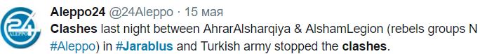 Медиа-активисты и СМИ оппозиции сообщили, что в подконтрольном протурецким боевикам городе Джараблус на севере Алеппо ведутся ожесточенные столкновения между группировками «Лива Султан Мурад», «Ахрар аль-Шаркия», «Файлак аш-Шам» и фракциями «Хаят Тахрир аль Шам».