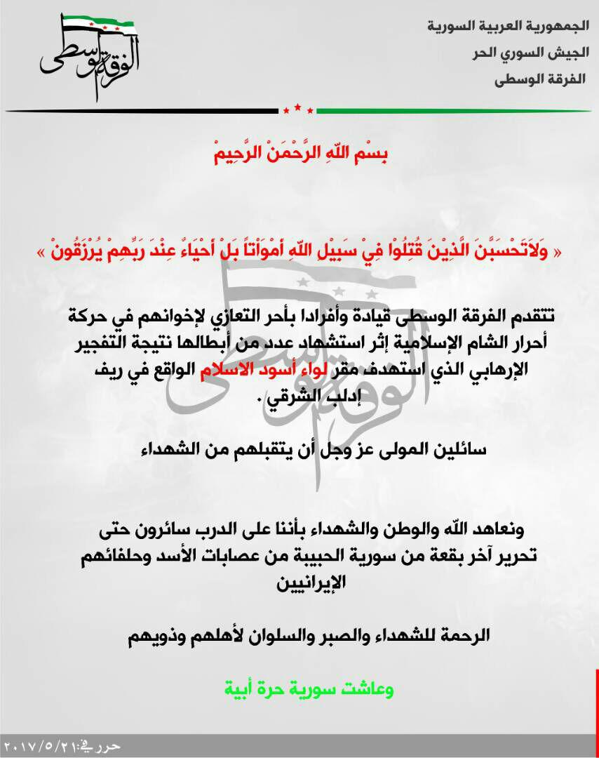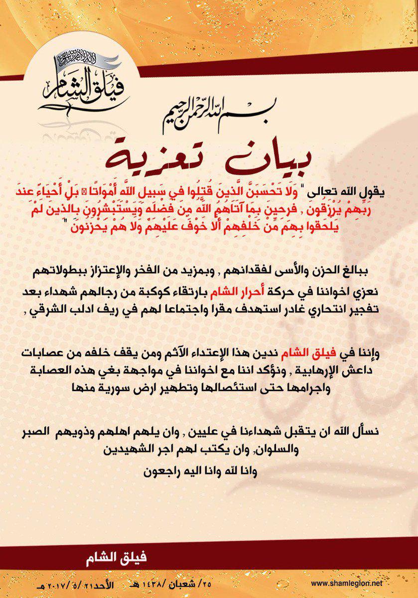 Многие «оппозиционные» банды выразили официальные соболезнования в связи с диверсией против одного из штабов «Ахрар аш-Шам», выражают готовность с ними вместе бороться против ИГИЛ (раскольников Багдади) или стать шахидами.