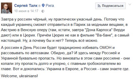 Я не преувеличиваю, а просто декодирую вот этот ликующий пост — человек с полуночи стоял в очереди, чтобы с утра возопить: ну всё, хана вам, москали, каждый украинец сможет понаехать в Париж за модными вещами! Вот так вот, скушали? Вот она, перемога, вот она — интеграция! Стоило страдать и унижаться!