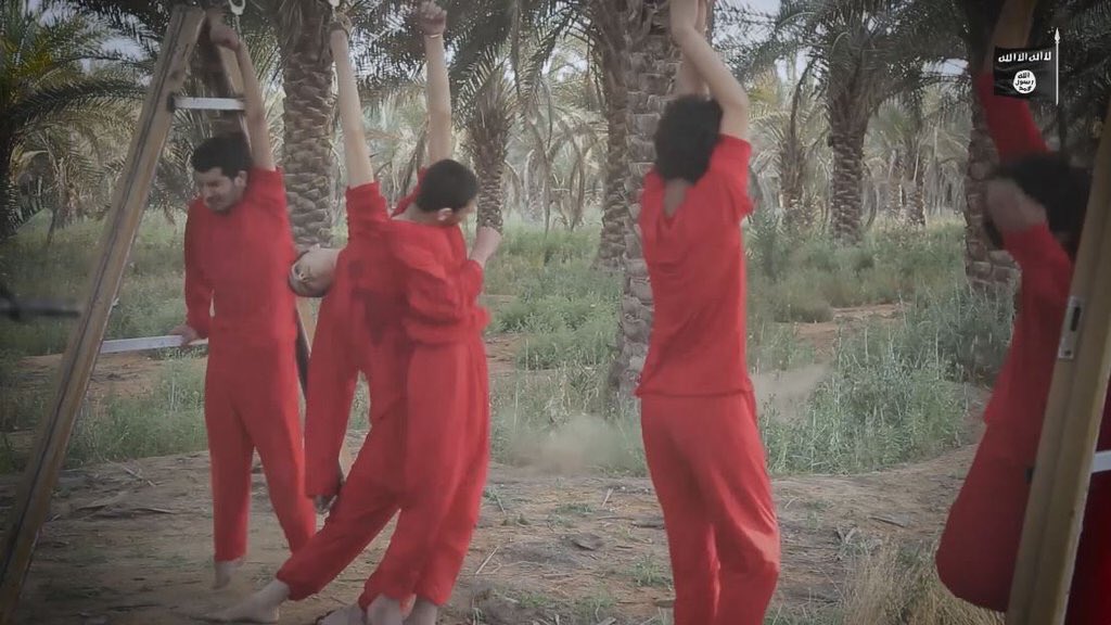 В ролике показано, как восемь боевиков проамериканской группировки «Джейш Махавир Аль-Таура» были захвачены в плен и вскоре после этого казнены «игиловцами» в провинции Дейр эз-Зор. Ниже приведены кадры из этого видео.