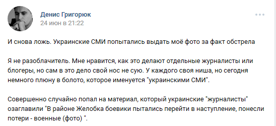 «И снова ложь. Украинские СМИ попытались выдать моё фото за факт обстрела… Совершенно случайно (я) попал на материал, который украинские „журналисты” озаглавили: „В районе Желобка боевики пытались перейти в наступление, понесли потери — военные (фото)”.