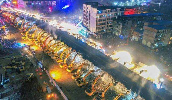 В Восточном Китае 200 экскаваторов, работающих синхронно, за 8 ночных часов демонтировали гигантский путепровод, чтобы построить на его месте новую шестиполосную скоростную магистраль.