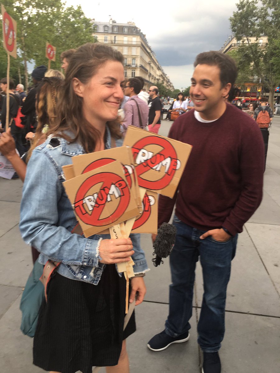 «Его решения по климату, курс по вооружению, антииммиграционные решения, дискриминация женщин… За это Трампу в Париже не рады», — говорит один из участников акции, цитируя листовку, висящую рядом на столбе.
