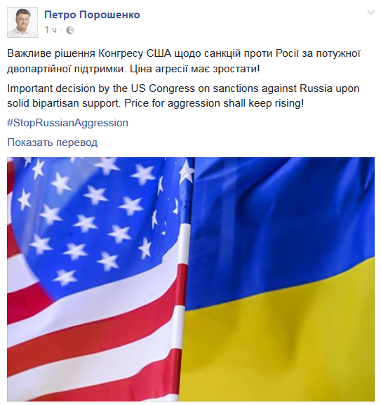 Президент Украины Петро Порошенко приветствует принятие Палатой представителей США новых санкций против России. Об этом он написал на своей странице в Facebook в среду, 26 июля.