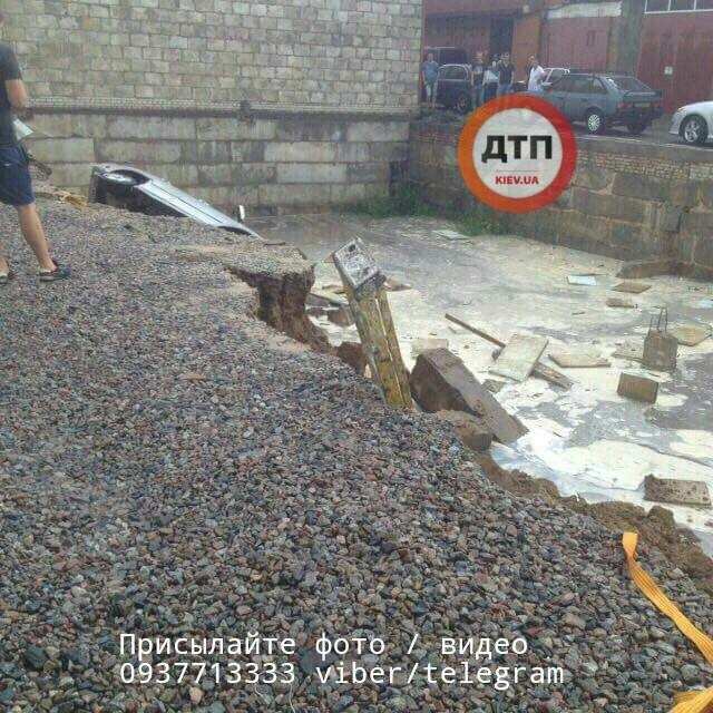 В Киеве на Борщаговке после сильного ливня образовался многометровый «провал», в который рухнули несколько автомобилей.