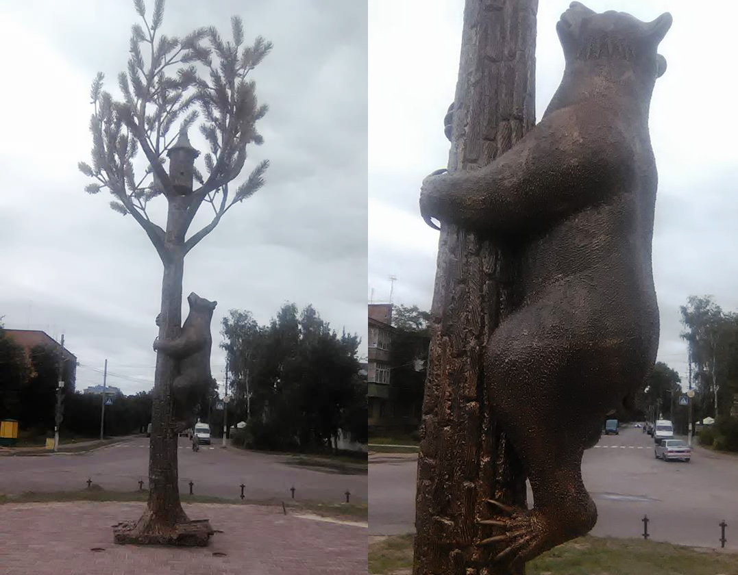 В поселке Сосница Черниговской области Украины установили шестиметровую скульптуру медведя на сосне, изготовленную по мотивам герба поселка.