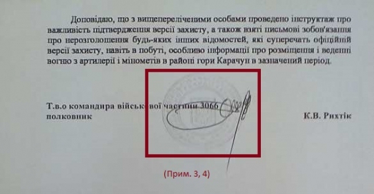 «Полковник Рихтик К.В. в то время действительно временно исполнял обязанности командира этой воинской части. И это единственное, что соответствует действительности», — подтверждает пресс-служба украинской Нацгвардии, но отмечает, что сама справка «насчитывает много разногласий, которые свидетельствуют о ее недостоверности».