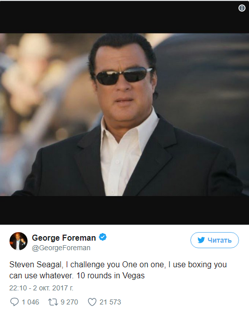 Бывший боксер-тяжеловес Джордж Форман через свой Twitter вызвал на поединок актера Стивена Сигала.