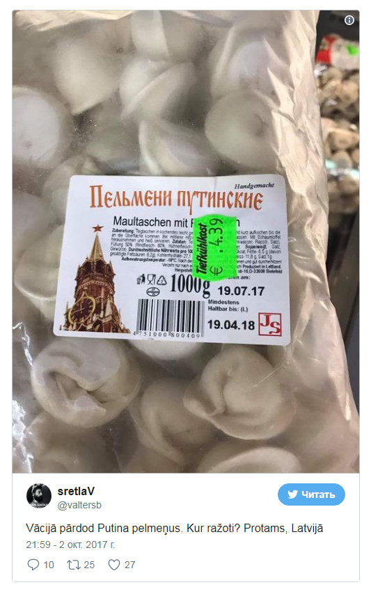 «В Германии продаются «Пельмени путинские». Где произведены? Конечно, в Латвии!» — написал в Twitter пользователь с ником Валтерс.