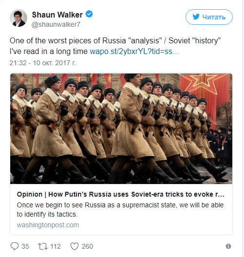 «Один из худших образцов „аналитики” о России и о советской „истории”, что мне довелось прочитать за долгое время», — пишет журналист Guardian Шон Уокер в Twitter.