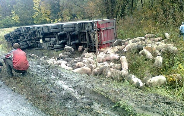 В Полтавской области возле села Вильшанка 12 октября съехала в кювет и перевернулась фура КамАЗ, которая перевозила 180 свиней. Около полусотни погибли.