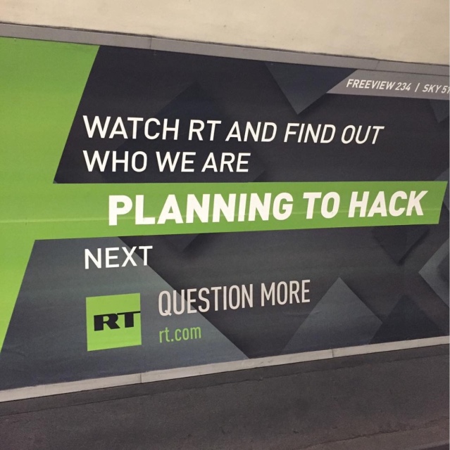 «Застрял в пробке? Проиграл выборы? Обвиняй нас!»; «ЦРУ называет нас „машиной пропаганды”. Узнай, как мы называем ЦРУ»; «Будьте бдительны! Здесь размещена реклама «рупора пропаганды»; «Смотрите RT и узнайте, кого мы взломаем следующими».