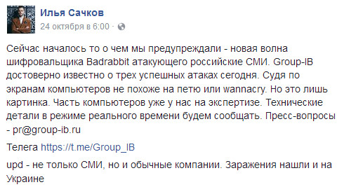 Так, основатель компании Group-IB Илья Сачков сообщил на своей странице в Facebook, что происходящее является новой эпидемией шифровальщика, получившего название «Badrabbit».