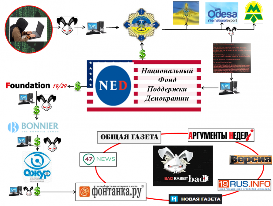 Пока не совсем понятно, кто именно первым попал под удар хакеров: украинские сервера NED или сами организации. Об этом умалчивает Киев, который явно обладал инсайдерской информацией. Далее через те же каналы NED «Плохой Кролик» доскакал и до аффилированных с фондом либеральных СМИ, которые по цепочке стали рушиться друг за другом.