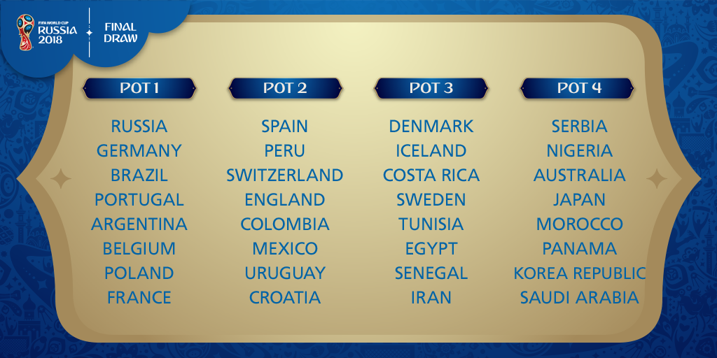 32 команды уже разделены на 4 жеребьевочные корзины (см.ниже). Сборная России точно не окажется в одной группе с Германией или Бразилией.
