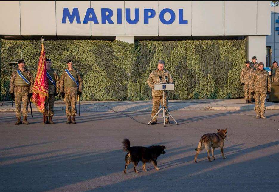 Фото было сделано в Мариуполе на оккупированной территории ДНР, куда Порошенко прилетел в пятницу, чтобы поздравить морских пехотинцев с профессиональным праздником.