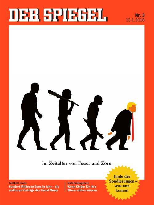 Иллюстрация является зеркальной пародией на «Марш прогресса» — знаменитый рисунок из книги К. Хауэлла «Ранний человек», на котором обозначены основные этапы эволюции. На обложке Spiegel сгорбленный Трамп, стилизованный под древних гоминид, помещен на нижнюю ступень развития.