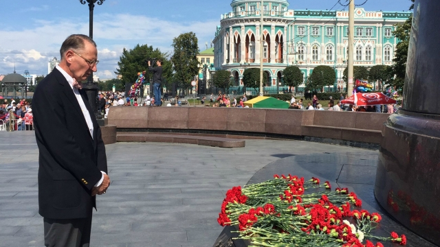 Генконсул Пол М. Картер возлагает цветы к памятнику основателям Екатеринбурга, август 2017