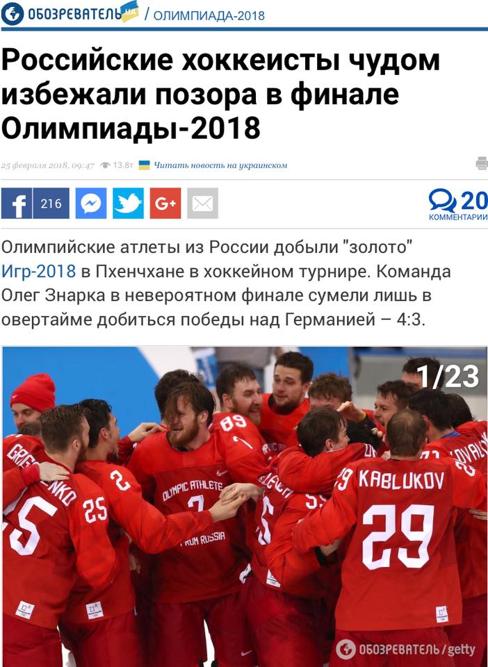 «Российские хоккеисты чудом избежали позора в финале Олимпиады-2018», — написал в заголовке своей статьи украинский сайт «Обозреватель», показывая, каким образом нужно писать о победе своего ненавистного врага.