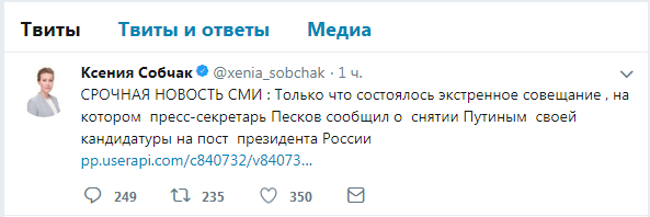 «СРОЧНАЯ НОВОСТЬ СМИ: Только что состоялось экстренное совещание, на котором пресс-секретарь Песков сообщил о снятии Путиным своей кандидатуры на пост президента России», — написано в сообщении.