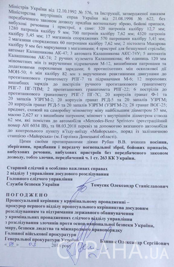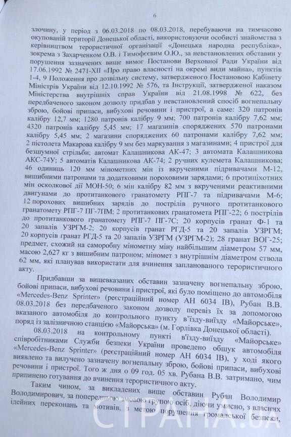 Украинское издание «Страна.уа» публикует текст подозрения Рубану, который оказался в распоряжении журналистов. Из документа следует, что переговорщику вменяют подготовку террористического акта и незаконное владение оружием.