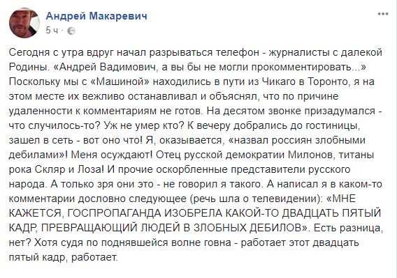 Лидер группы «Машина времени» Андрей Макаревич на своей странице в соцсети прокомментировал однозначную и понятную реакцию россиян на его вчерашний пост, в котором он сравнил жителей РФ со «злобными дебилами».