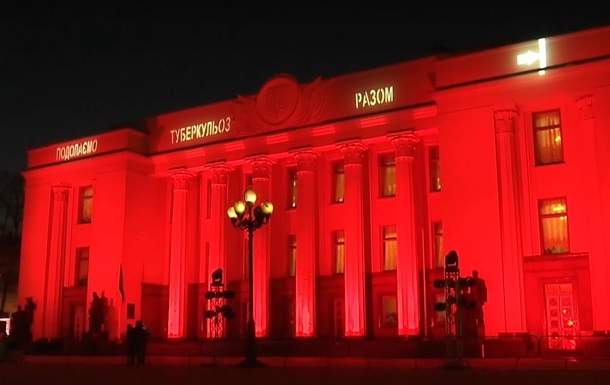 Вечером 22 марта здание Верховной рады в Киеве окрасилось в кроваво-красный цвет, а на фризе (верхней части) фасада появилась надпись: «Победим туберкулез вместе».