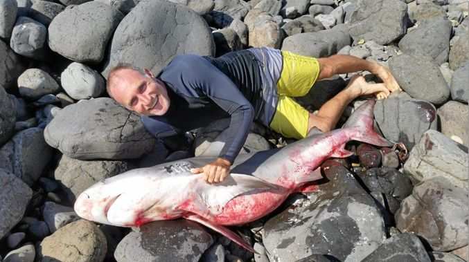 Австралийцу удалось справиться с акулой и вытащить ее на берег. На фотографии, сделанной после инцидента, он позирует на каменистом пляже рядом с мертвой рыбой, длина которой сопоставима с ростом взрослого человека.