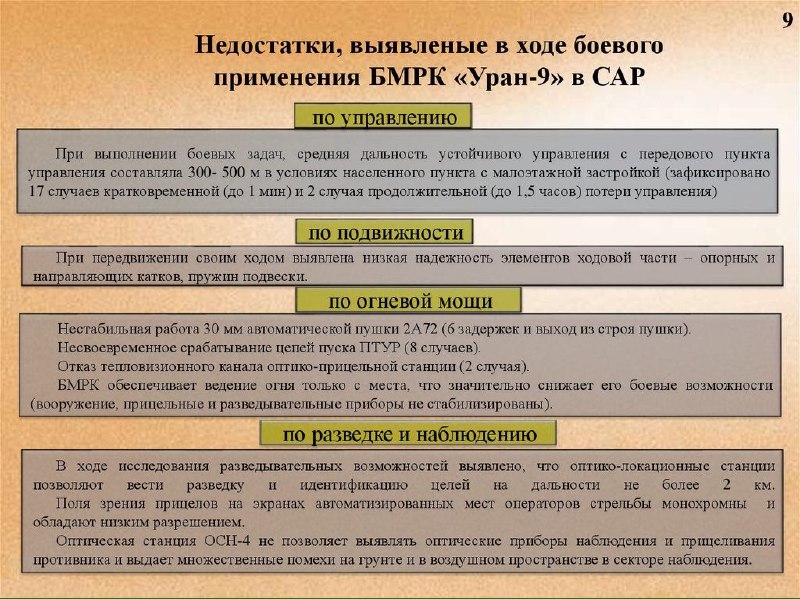 В докладе военспецов третьего НИИ Минобороны говорится о прицелах, экранах операторов и приборах наблюдения как о проблемных узлах. Упоминается также неспособность робота вести разведку и определять цели на расстоянии более двух километров.