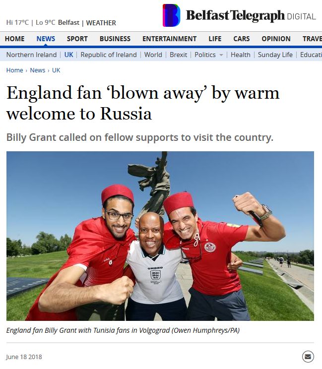 «Я хотел бы сказать каждому: не верьте тому, что вы читаете, приезжайте и убедитесь сами», — говорит темнокожий болельщик сборной Англии Билли Грант со страниц газеты The Belfast Telegraph.