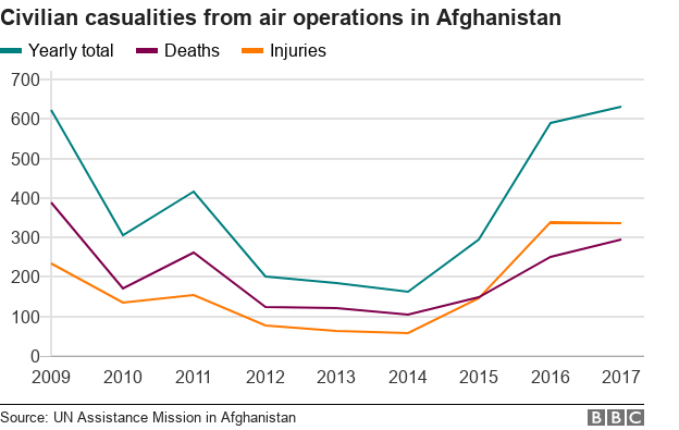 За первые 5 месяцев 2018 года американские ВВС совершили 2 339 воздушных налетов с использованием штурмовой и бомбардировочной авиации. Таких интенсивных бомбежек в стране не фиксировалось минимум с 2009 года, а то — и ранее. Возрастает и интенсивность налетов. Американское командование в Афганистане сообщило о том, что с начала года в стране было использовано более 5,6 тысяч ракет и бомб против 4,3 тыс. за весь 2017 год.
